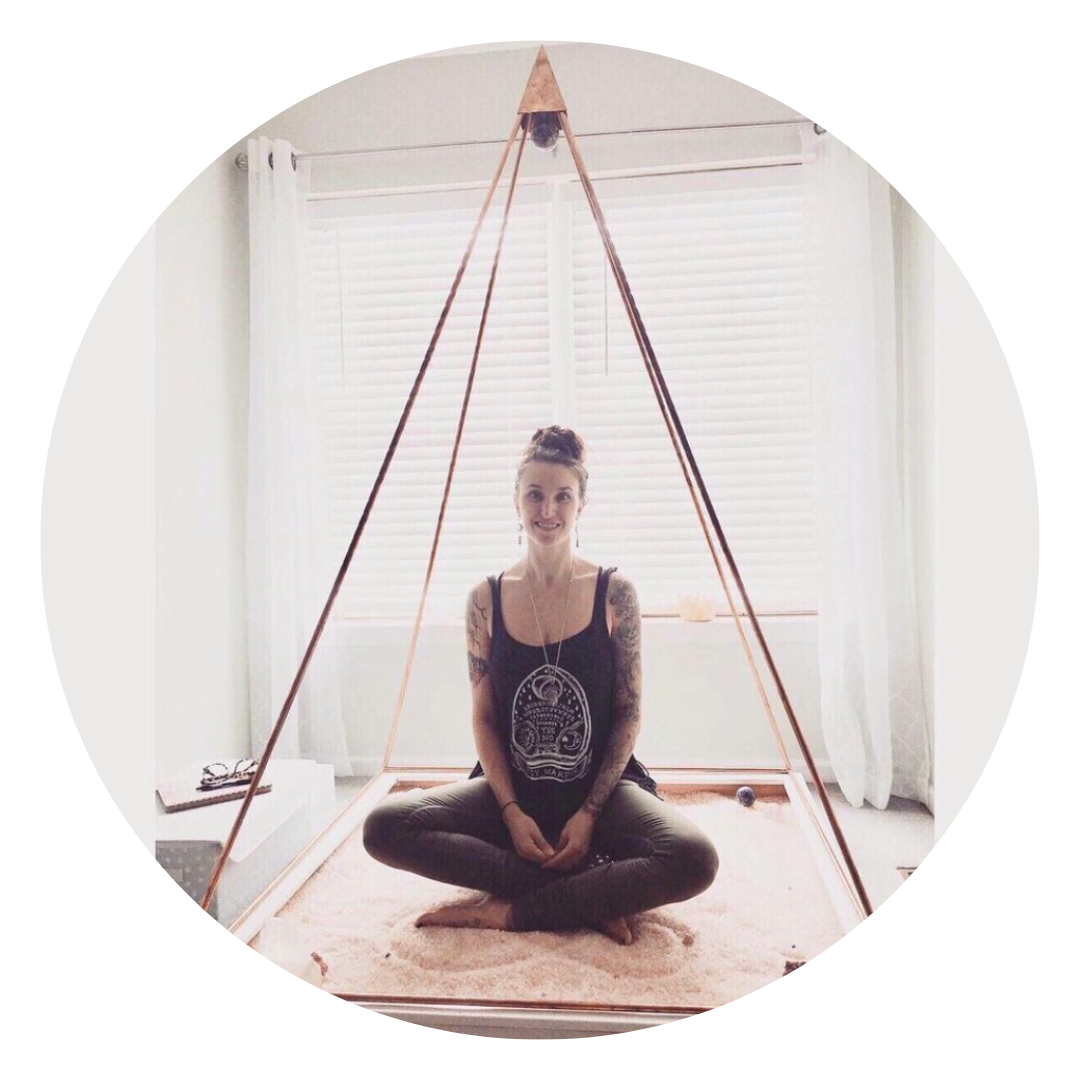 A woman with tattoos sitting cross-legged on a pink rug in a sunlit room, inside a wooden teepee frame with white curtains and horizontal blinds in the background.